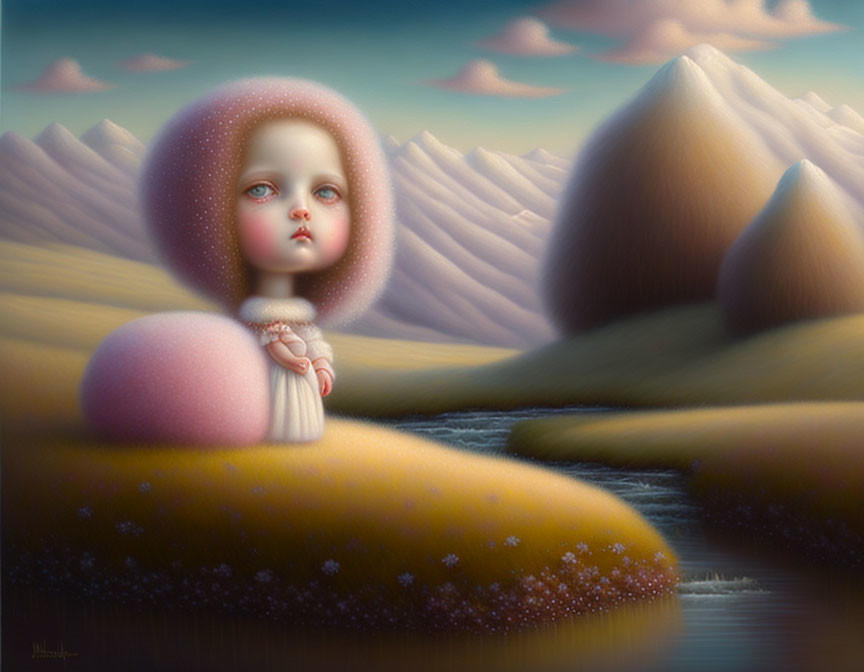 Surreal toddler in pink dress by stream with stars and whimsical trees