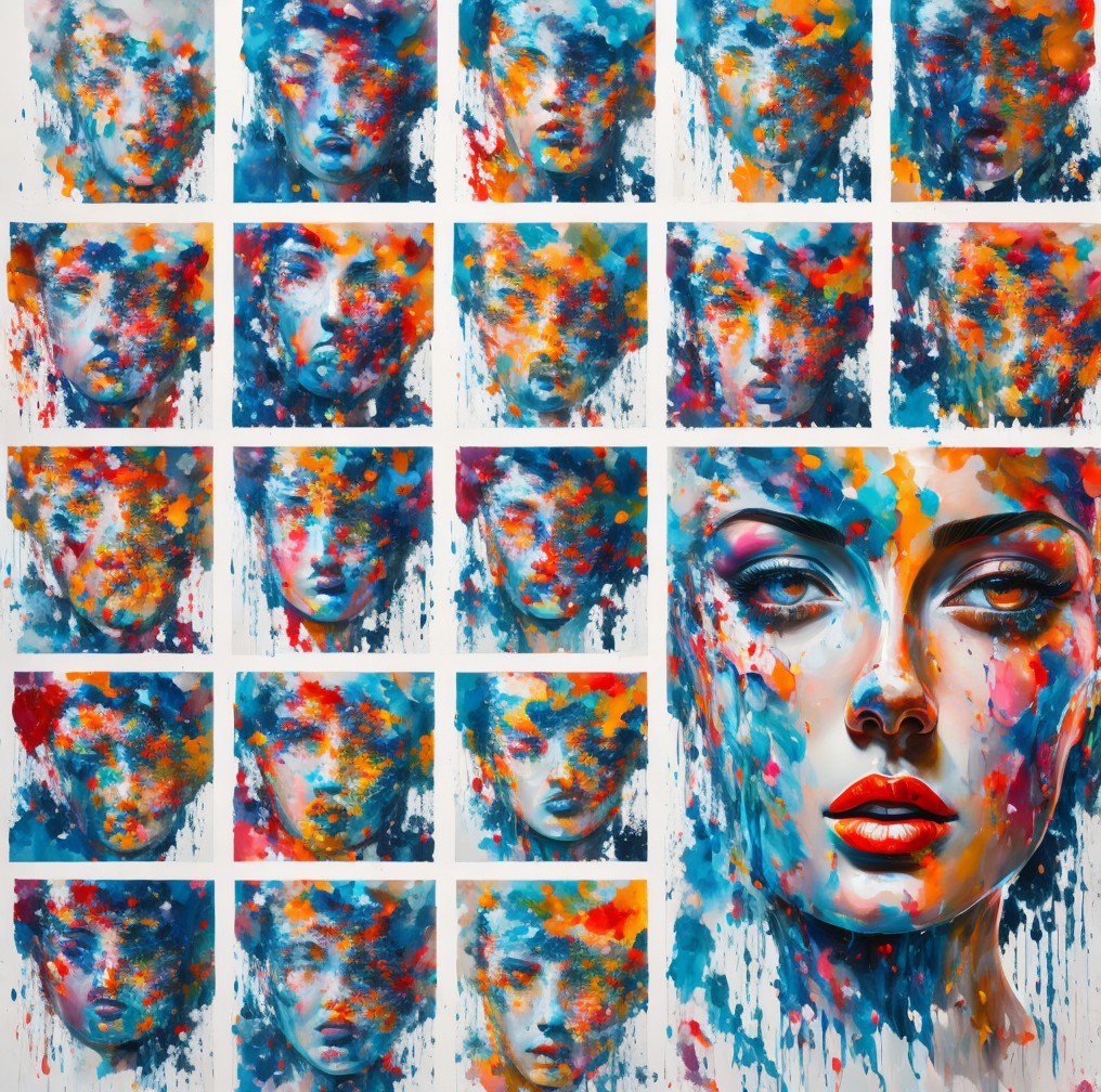 + Prompt:{Abstract head and shoulders portrait of a beautiful woman} Surrealism, Impasto, Thick Paint, Paint Drips and Splatters, Medium brush strokes, in the style of Jackson Pollack, representing an Unsettled State of Mind,