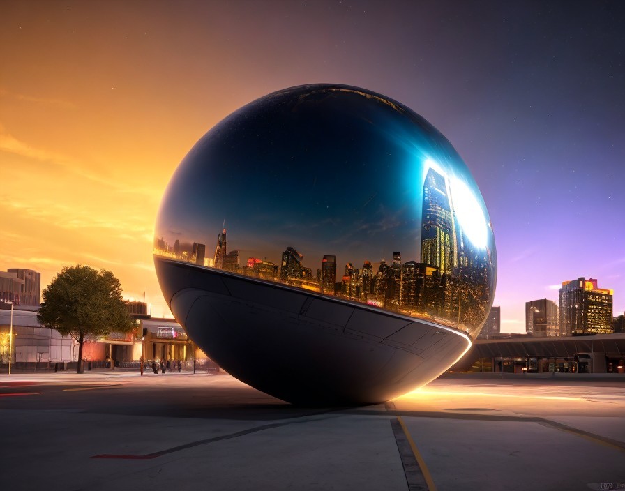 Glossy Sphere Reflecting Twilight Sky in Snowy Landscape