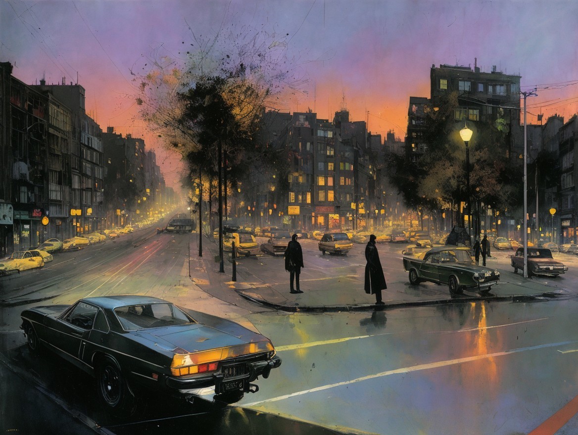 + Prompt:Spectrum Magazine, Graphic Novel surrealistic Comic Art by Bill Sienkiewicz, Francis Bacon, Marc Chagall, Ben Templesmith, Dave McKean, Zdzisław Beksiński, Brom, A bustling city street at dusk, illuminated by the headlights of numerous cars traveling in both directions. The road reflects golden hues from the setting sun and the artificial lights, creating a warm ambiance. On either side of the street, dark silhouettes of trees with bare branches frame the scene, enhancing the urban feel. Tall buildings stand in the background, some with glass facades that catch the fading light, while others display bright signage. The sky transitions from orange to deep blue, hinting at twilight. The overall atmosphere is dynamic and lively, capturing the essence of city life.