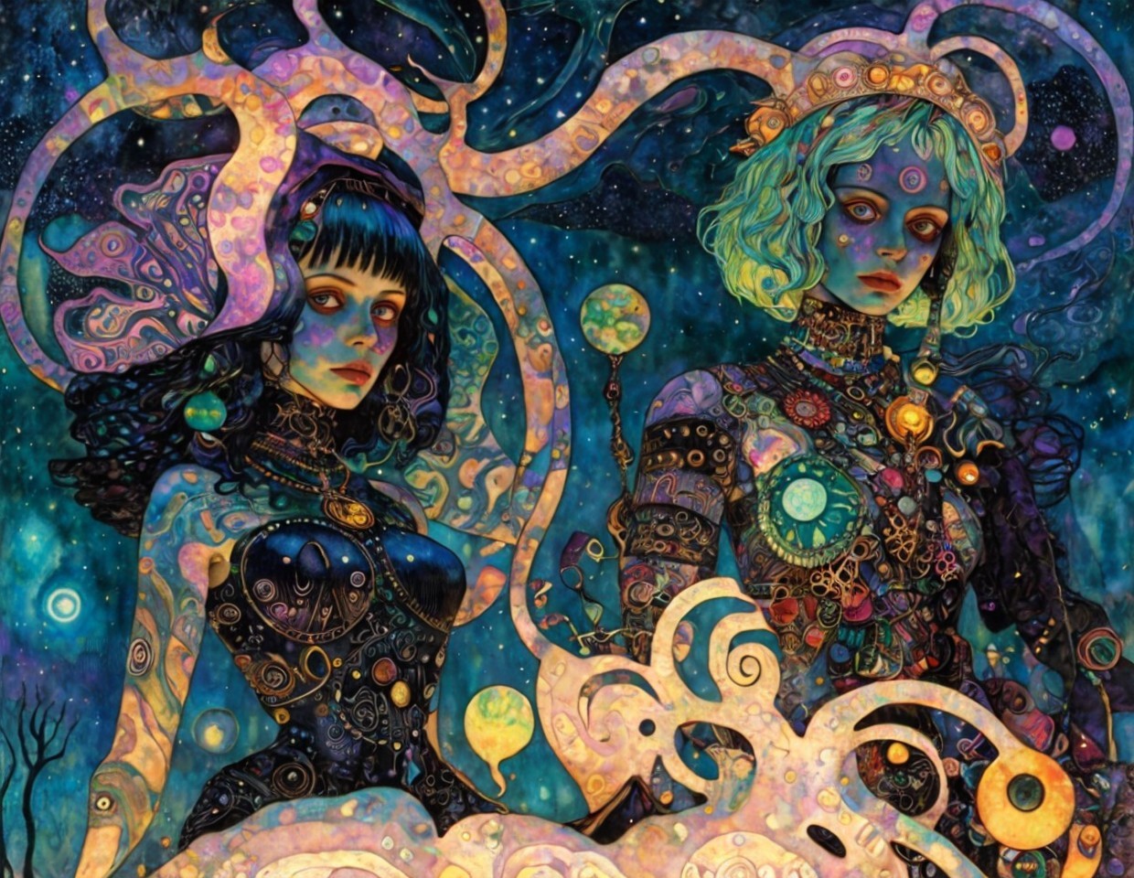 Prompt: beautiful witches, eldritch landscape background, aurora borealis, eldritch details, cyberpunk, by Egon Schiele, Paul Klee mixed media, metallic inks by Gustav Klimt , "horror themed, ink details and realistic textures created by Dave McKean and Richard Corben