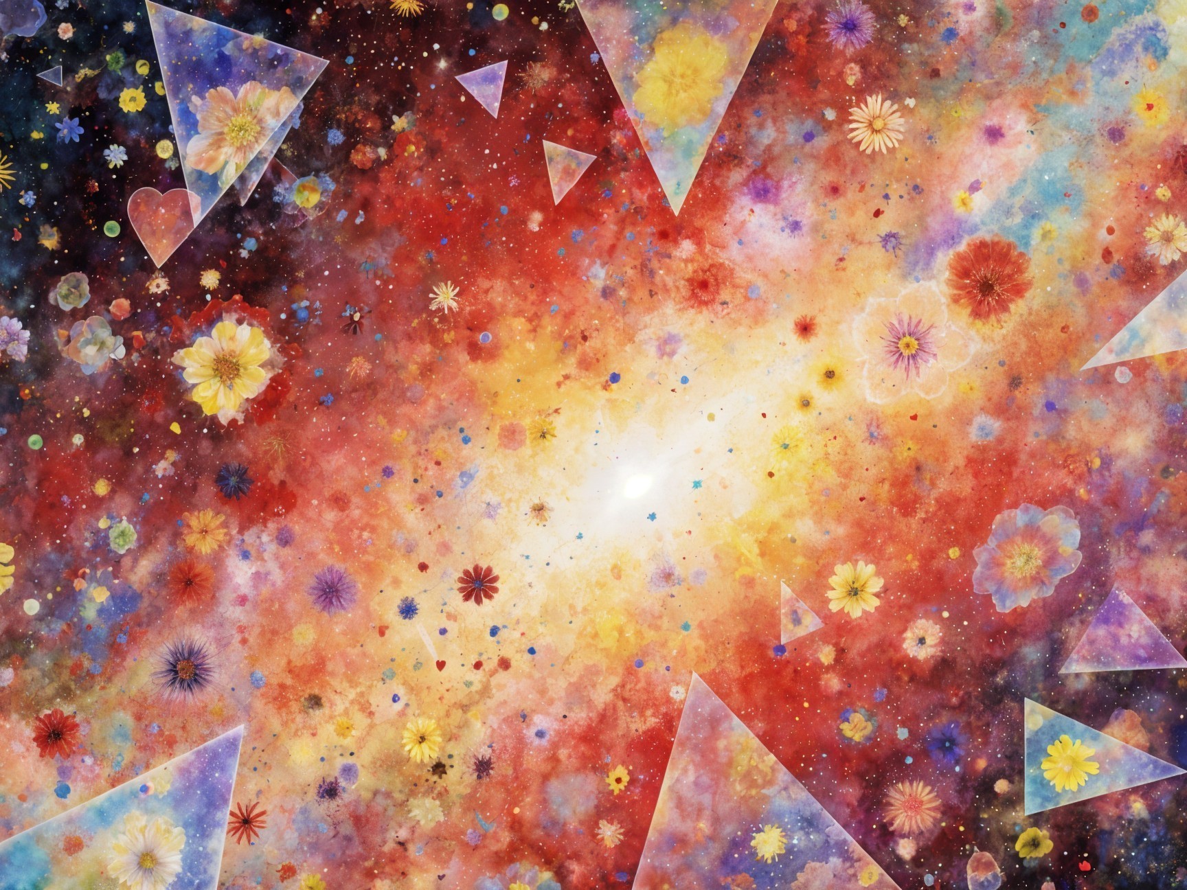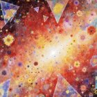A vibrant cosmic scene filled with colorful, abstract flower shapes, intertwined with sparkling gems and a galaxy of stars. The palette includes reds, yellows, and purples, creating a mesmerizing effect. Thankyou * All
