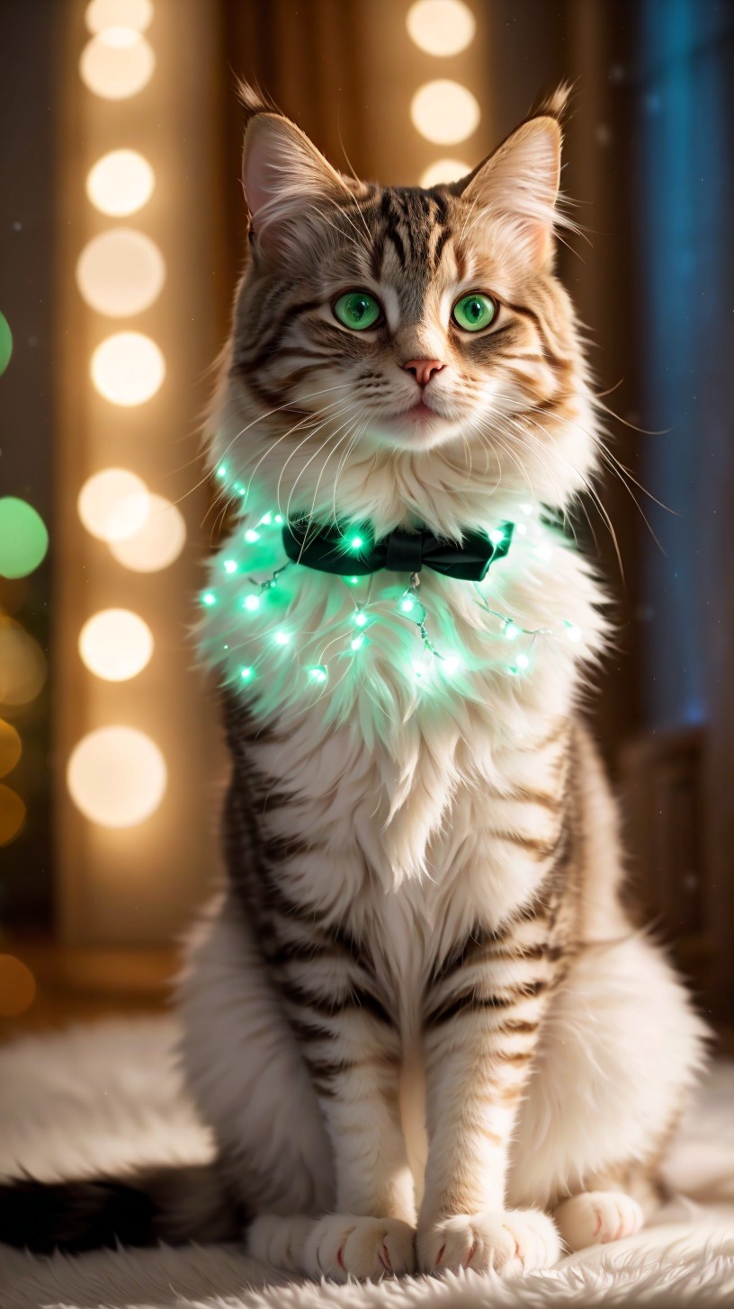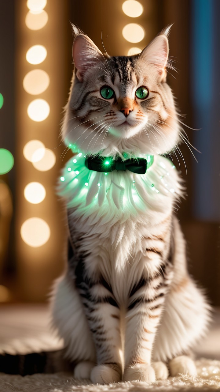 A majestic tabby cat with striking green eyes sits proudly. It wears a glowing green collar, surrounded by soft bokeh lights, creating a festive and enchanting atmosphere.