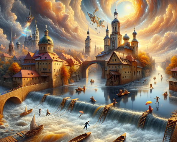 A majestic, oversized cat stands amidst a vibrant, dreamy landscape filled with colorful flowers, majestic mountains, and quaint houses, surrounded by fluffy clouds and shimmering water.