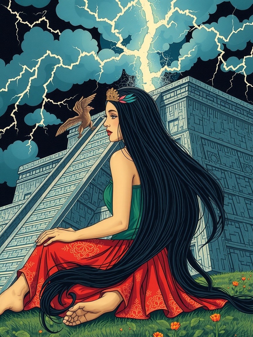 Guatemalan woman with Long flowing black Hair, sitting in front of lightning , mayan pyramid, Style: Möbius, Daniel Merriam, Egon Schiele, Alphonse Mucha, Anna Dittman, illustration