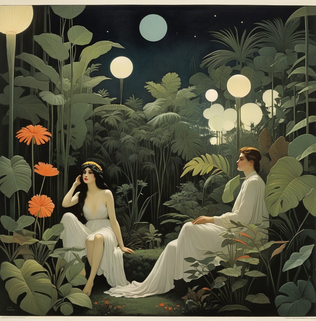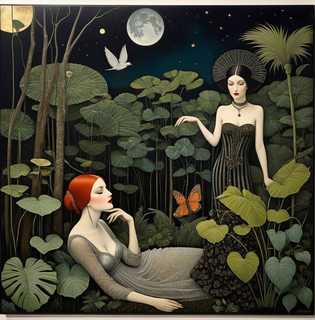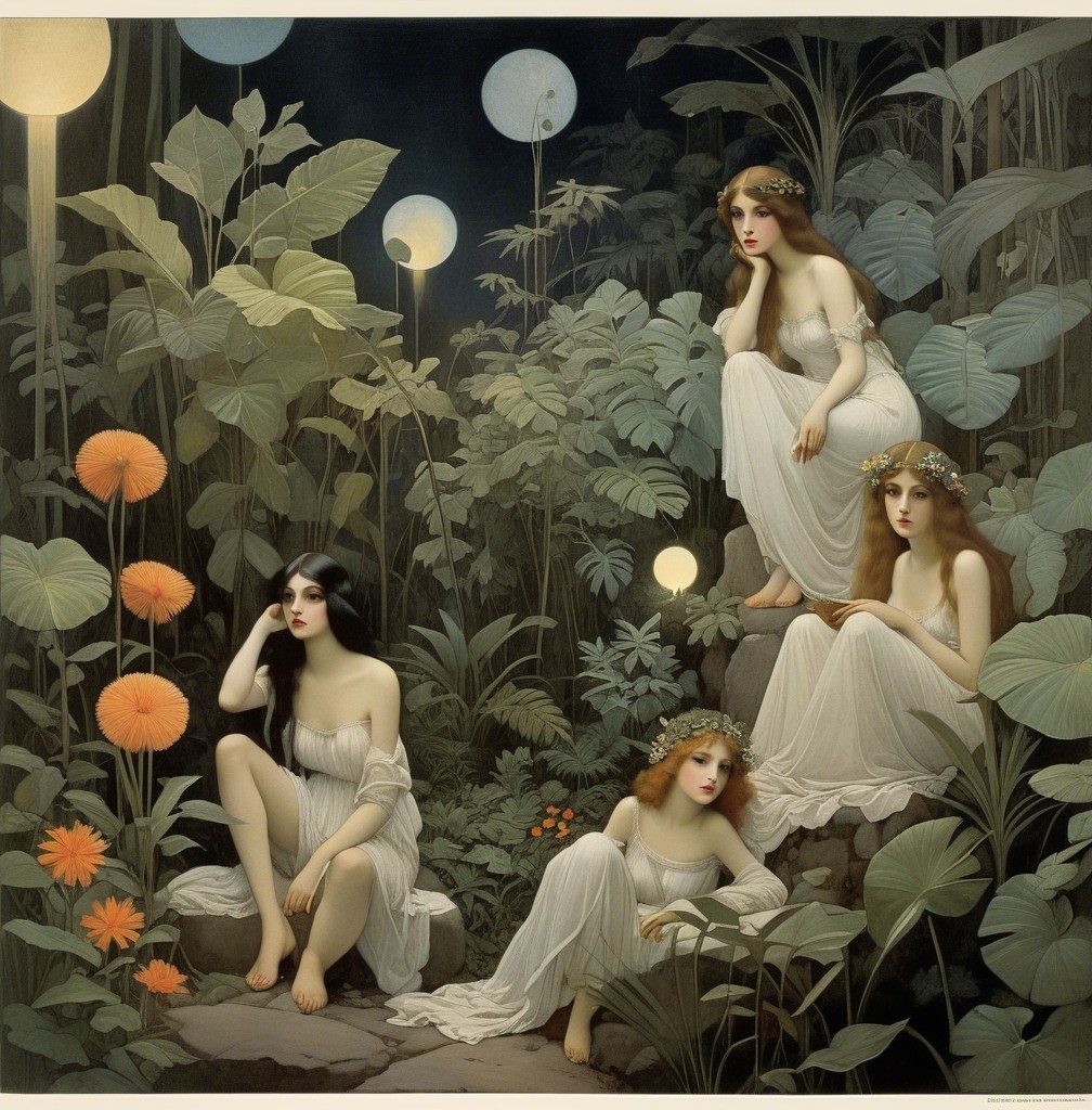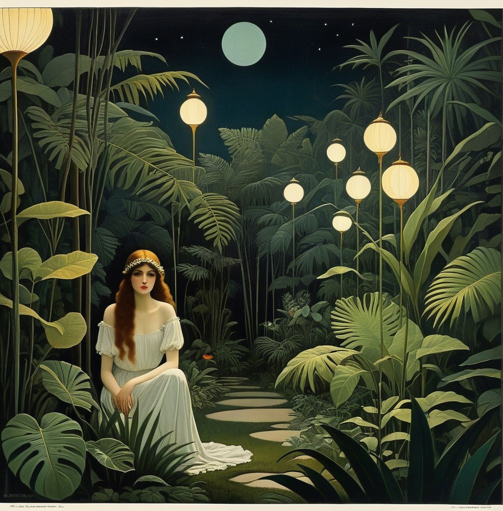 A serene woman with red hair lounges by a moonlit pond, surrounded by lush greenery and flowers. Butterflies flutter in the night, creating a tranquil, dreamlike atmosphere.
