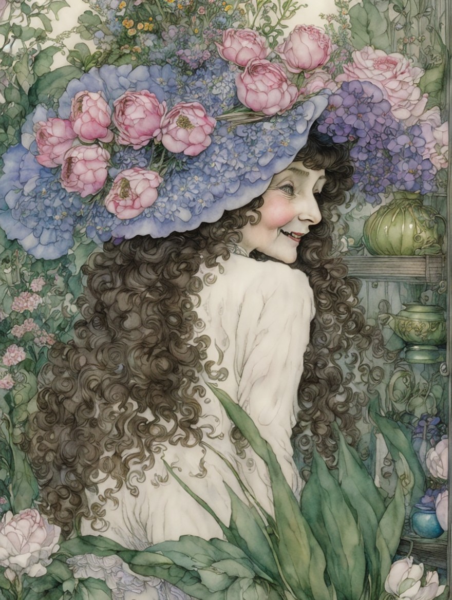 A young woman with long, curly hair smiles softly, adorned with a large hat topped with pink roses. She stands in a cozy kitchen filled with plants and colorful pottery, exuding a cheerful charm.