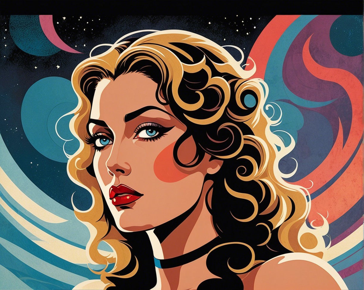 Prompt: Stylized woodblock print, Comic book art merged with abstract art and collage illustration, reminiscent of logo design, Handsome serene temptress with devilish eyes and curly hair, romantic abstraction, Dark gothic ambiance, contouring lines of Dejah Thoris and patrick nagel, academical Style, Seductive, Sensual, eroticism, hues by Overton Loyd, line-art hairstyle with 3D texture brushlines; zentangle patterns, warm colours of orange black beige and red,.multi-layered style; cel-shaded, uhd, hdr, hues in pale blue and soft beige, tints in style by Georgia o'keffee, Overton Loyd, Jeannette Guichard-Bunel, Remedios Varo, overall composition in space age style, stacked-up perspective, detailed line drawing on old paper, hues in tiny lines, stacked lines, marvel comics art, style of Georgia O'Keefe, Jackson guice, Geof Darrow, harrison fisher, William Turner, Patrick Nagel and Overton Loyd, Art Nouveau details by barclay shaw, fauvistic, bold lineage illustration, wide angle, brass, grain, metallic details in lineage in black ink, fancy, moody, stylized modern collage illustration merged with abstract art, stylized lighting from top to centre, divisionism, small circles, grunge, anisotropic filtering 1.7, shadow mapping 1.3, minimalistic, simplified plasticity 1.3, beautiful marvel comic book character, orange to beige color palette, 1950s space age style by Curtis Cole, close-up, 3 layers of dof, traumacore 1.2, octane render illustration,, comic book art, overall stylized illustration by Chris Foss and Overton Lloyd, plasticity 1.3, octane render, uhd, hdr, high coloring, brightness 1.9, ambient occlusion 1.5,raytraced shadows 1.8