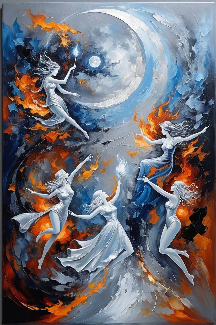 Five ethereal female dancers dance in swirling clouds, flames surrounding them, under a glowing moon. Their flowing garments and dynamic movement evoke a sense of energy, fantasy and grace