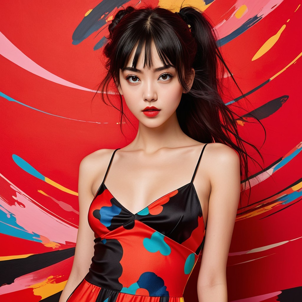 (Try from garicten) - A striking model poses confidently against a vibrant red background with colorful swirls. She wears a chic, colorful dress and has long hair styled in playful ponytails, accentuating her bold makeup.