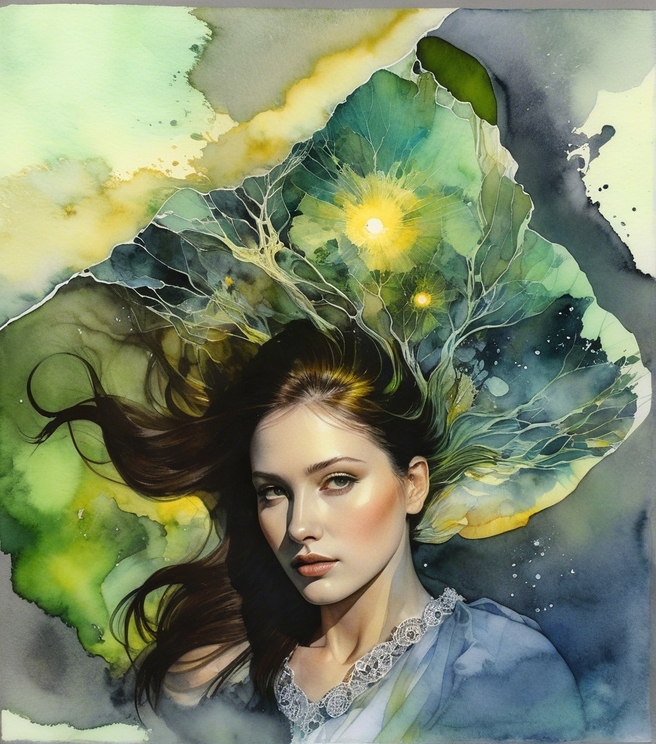 Portrait, top view, watercolor and ink, charcoal illustration, dyed, double exposure effect. Opaque, translucent, eerie, cryptic, indiecore, bioluminiscent features, layered, merged styles by Mike Minor and Robert McCall, tetradic color scheme light-green umbra sea-green goldenrut-yellow. hues by Ed Binkley and John Berkey. Watercolor and ink, alcoholic ink, collagraphy, visible textures, blotting quill pen, tesselated smooth reflections, brightness 1.4, joyful 3 point lighting, consistent lines with varying thickness for a coherent and nuanced compositionhues, dyed, tiny lines, stacked lines, tall and lean details, stylized lineage drawing by Susanne Seddon Boulet, layers of fabric, cel-shaded, sculpted, retrofuturistic, divisionism by Igor Zenin. bokeh, --ar 1:1 --q 2 --s 750, brightened color palette, pointilism, mokuhanga art, multi-layered eyes, stylized hairdo, post-avantgarde style, fine-line illustration, gradient inking, tesselated, graphic emphasis, visible textures, subtle, Surreal movie still, blurry, color palette of light-yellow, light sea-green, flares of light-green, vivid and polished coloring, radiance, 3 point lighting, flecks, dots, splashes, crumbs, geometrical shapes, slightly surreal with dappled lighting and diffused hues, enhanced by rim lighting and ambient occlusion. Utilize parallax occlusion 1.3 for depth, incorporating shimmering light reflections and brushed atmospheric effects. UHD, HDR at 128K UHD resolution with a psychedelic touch, golden hour, abstract, smeary, linocut reference, anthotype print, black brushstrokes adding depth, dyed, contoured, hues by Man Ray, line-art, thick textured layers, contoured, tactile feel, simplistic features, intricate detailing, warm pastel color palette, simplistic, intricate indiecore details, smirky smile,