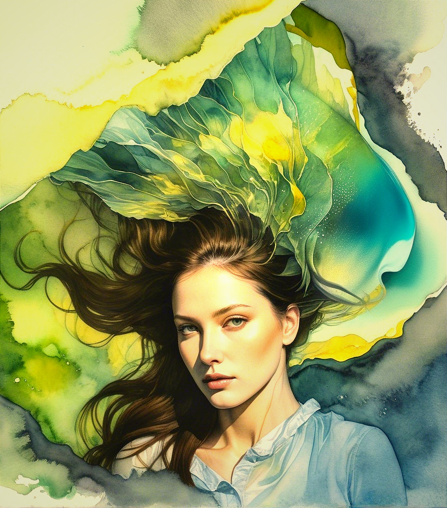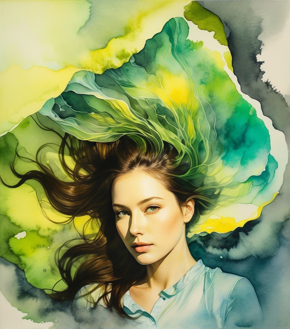 Portrait, top view, watercolor and ink, charcoal illustration, double exposure effect. Opaque, translucent brightness 1.4 , foggy waterpaint, fluorescent indiecore, bioluminiscent features, layered, merged styles by Mike Minor and Robert McCall, tetradic color scheme light-green umbra sea-green goldenrut-yellow. hues by Ed Binkley, embodiment by John Berkey in watercolor and alcoholic ink, collagraphy, visible textures, blotting quill pen linework, tesselated smooth reflections, colorful flares in pointilism style, mokuhanga art, multi-layered eyes, stylized hairdo, post-avantgarde style, fine-line illustration, gradient inking, tesselated, graphic emphasis, visible textures, subtle, Surreal movie still, blurry, joyful, 3 point lighting, consistent lines with varying thickness for a nuanced composition, emulsion shifts in hues, gradient inking coloring, thinned paint, otherworldly, warm colors, triadic color scheme dark-green baby-blue light-beige, dyed, tiny lines, stacked lines, tall and lean details, stylized lineage drawing by Susanne Seddon Boulet, layers of fabric, cel-shaded, sculpted, retrofuturistic, divisionism. bokeh, --ar 1:1 --q 2 --s 750, brightened color palette in rosewood-pink to sea-green, color palette of light-yellow, light sea-green, flares of light-green, vivid and polished coloring, radiance, 3 point lighting, flecks, dots, splashes, crumbs, geometrical shapes, slightly surreal with dappled lighting and diffused hues, enhanced by rim lighting and ambient occlusion. Utilize parallax occlusion 1.3 for depth, incorporating shimmering light reflections and brushed atmospheric effects. UHD, HDR at 128K UHD resolution with a psychedelic touch, golden hour, smeary, linocut reference, anthotype print, black brushstrokes adding depth, dyed, contoured, hues by Man Ray, line-art, thick textured layers, contoured, tactile feel, simplistic features, intricate detailing, warm pastel color palette, simplistic, intricate indiecore details, smirky smile,