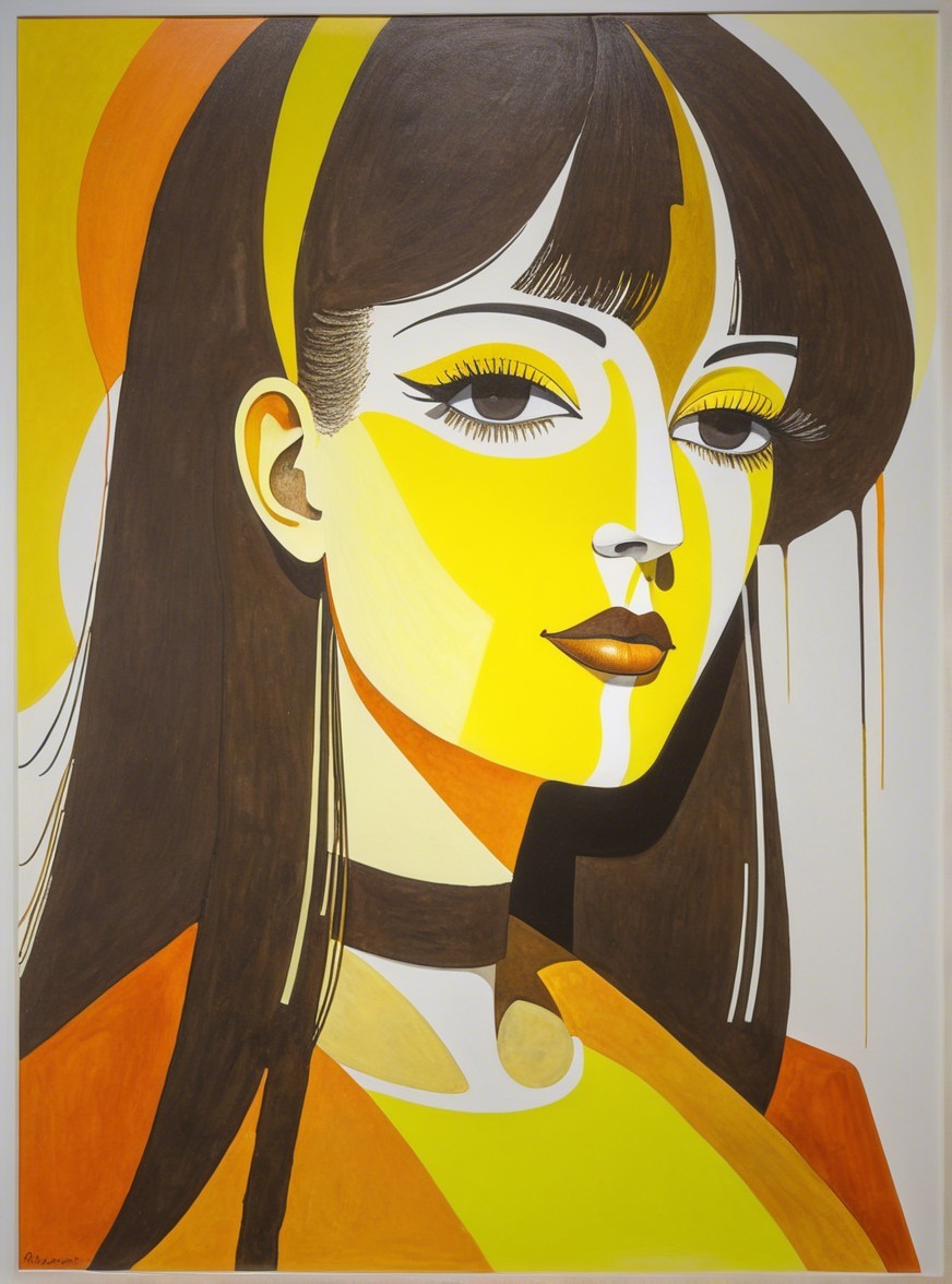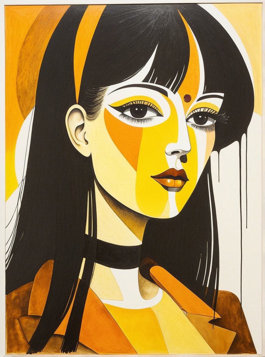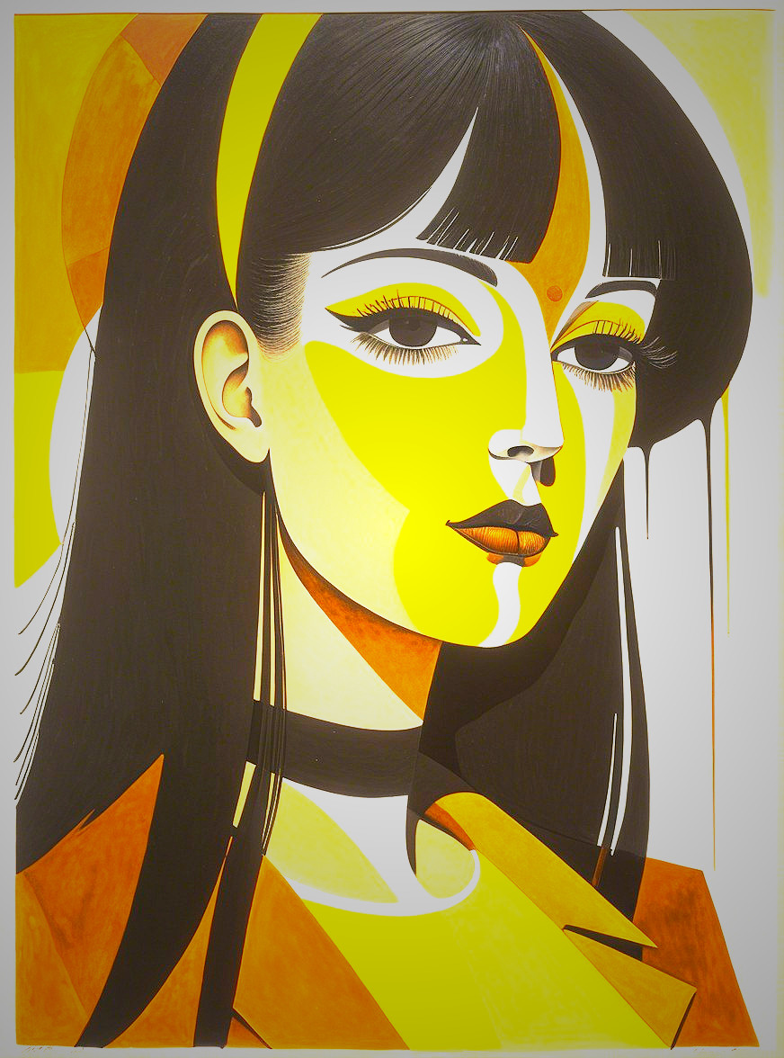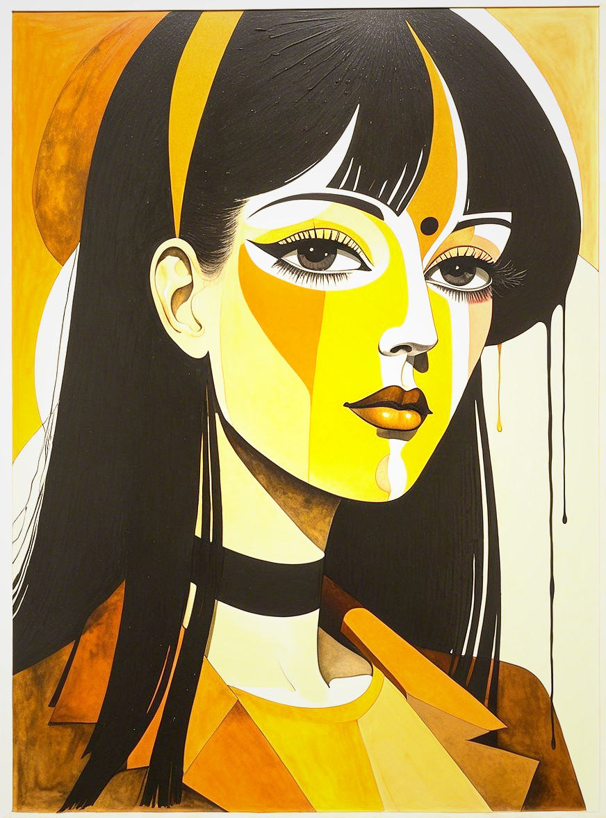The image features a stylized portrait of a woman with long, dark hair. She has bold yellow and brown hues in her face, large expressive eyes, and is adorned with a dark choker, exuding a vibrant aura.