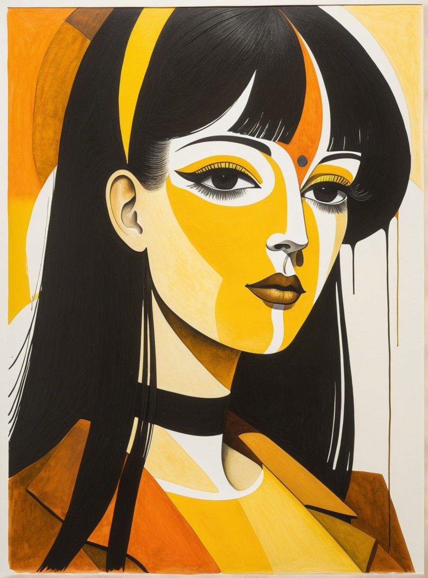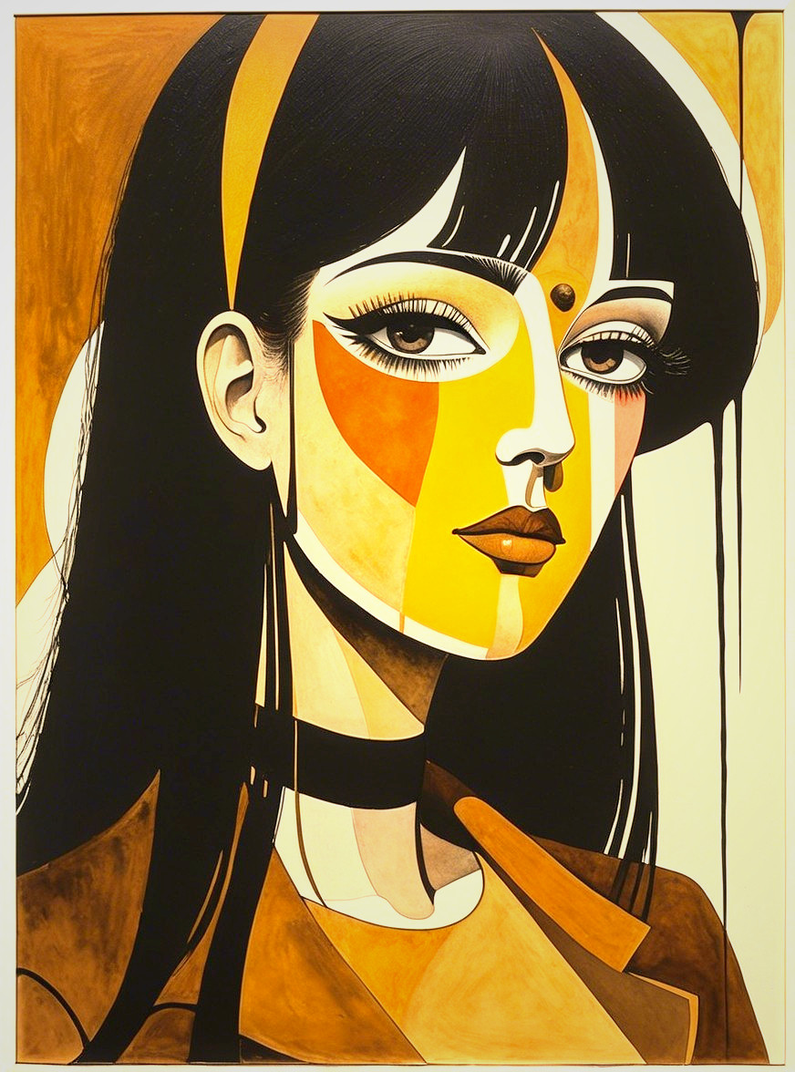 Prompt: Wet on wet painting by saul steinberg and Hugo Pratt and Ho Baron, figurative, fantasy, tonalism, unparalleled detail, paper fibers, soft eroticism, splash ink technique in style of Marc Allante, colorful yam, warm coloring, earth tones, dark-yellow, metallic-honey, soft rounded edges, Pencil and Pastels, ink and alcohol, aquatint merged with aquarelle extrusion, stylized facial features, baked-milk-tones contoured by black ink, micro-pen lines, watercolor effects akin to adorable psychedelic art by Stan Lee, american gothic, triadic color scheme of light-yellow, burnt orange, and sienna in intricate patterns and textures, stippled shadow effects, visible textures, coherent line-artwork by david graeme Baker and Marc Allante, woodblock print featuring a stylized portrait with a juvenile essence, printmaking-inspired illustration, dynamic gradient coloring, intricate linework, utilizing a warm color palette blending beige and brown hues, detailed patterns, natural lighting casting soft shadows to increase the depth and scale, slightly sculpted, flowing hair illusion elements for a surreal touch, overall liminal and luminous feel, plasticity 1.6 effects, dynamic lighting, unique hues of Ho Baron and the lighting style of Ed Paschke for wavery texture patchwork and pellucid details, incorporating juminocore elements and a hint of grunge for a fusion art style, precise Gelsculpt, ((layered paper texture, (vibrant hues, (softened yellows, light-orange, goldenrut-yellow), highly emotional), 3 layers of dof), 9:13, coherent line-art features), multi-layered eyes, serenity, joyful, gradient inking watercolors, asymmentrical geometric lines, line-art, HDR, crisp quality, reminiscent of 1970s european comic book art, brightness 1.9, rule of thirds, radiance, fusion of geometrical styles with elements of foampunk, detailed line art to create whimsical traumacore with hatching details and a soft, ethereal atmosphere, juminocore merged with comic book art by Patrick Nagel