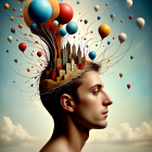 A surreal portrait of a person with a castle atop their head, surrounded by colorful balloons. A dreamy landscape of ships and clouds completes the imaginative scene under a large moon.