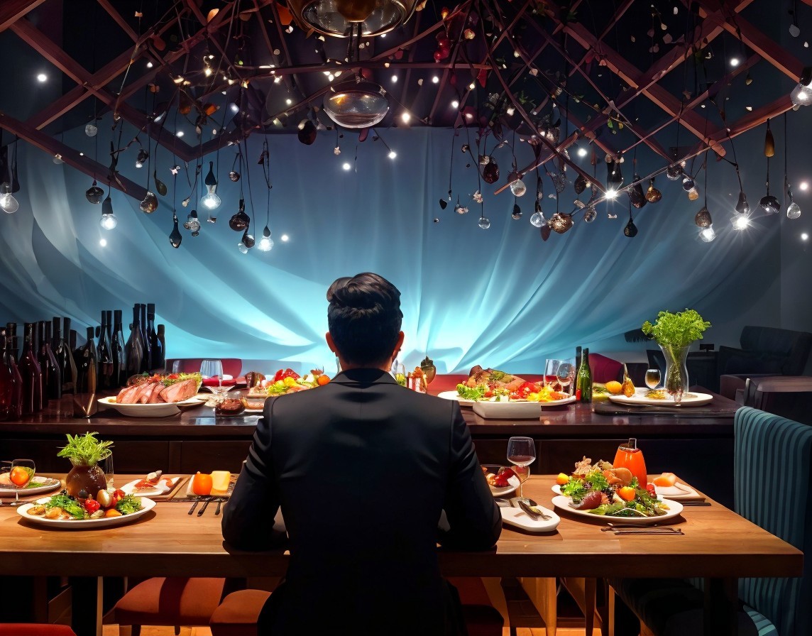 A person in uniform sits at a table with food, facing an intense scene with explosions, fire, and armed figures in a chaotic background.