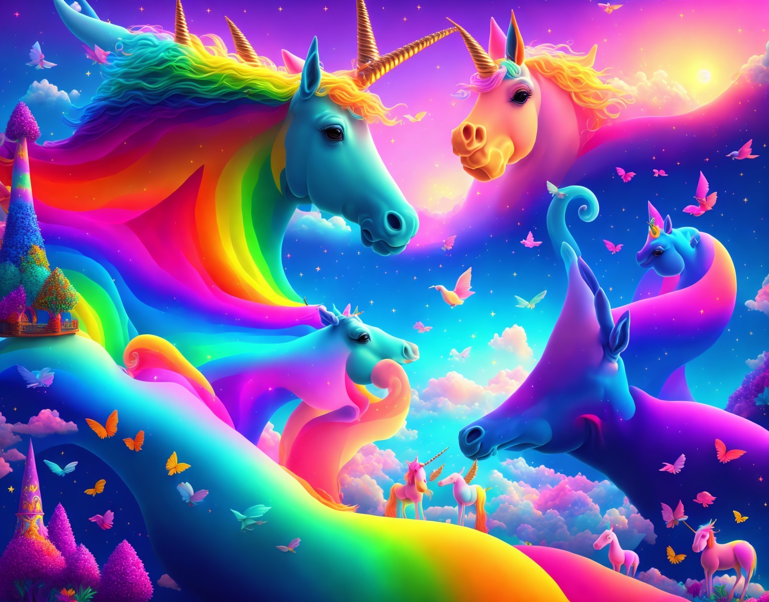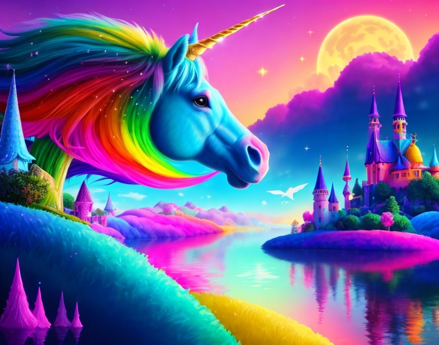 A vibrant fantasy landscape with a majestic unicorn, colorful trees, castles, rainbows, and birds soaring under a dreamy sunset sky.