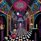 A vibrant, surreal architectural space features bold colors and intricate designs. It includes a patterned floor, ornate walls, and striking celestial motifs, creating a dreamlike atmosphere.