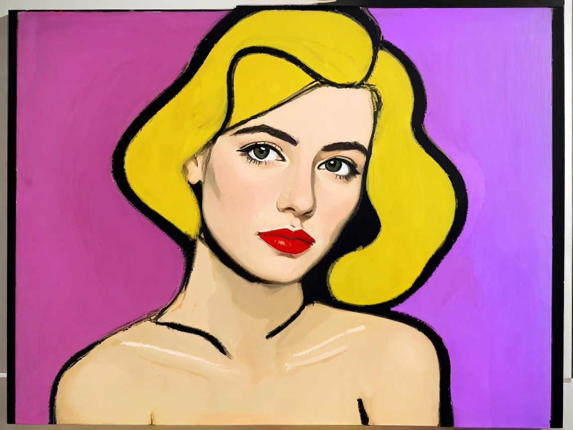 A stylized portrait of a woman with striking blonde hair and bold red lips against a vibrant purple background, showcasing a modern, graphic Pop art style with clean lines and vivid colors.