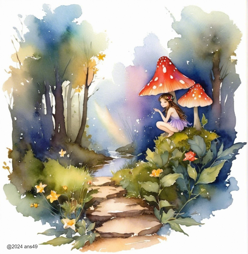 A whimsical watercolor of a girl sitting on a large red mushroom beside a forest path, surrounded by greenery and flowers.