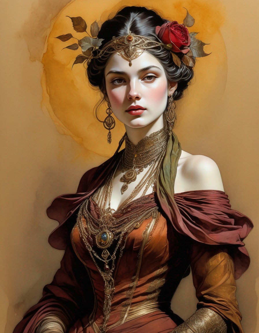 Illustrated woman with jeweled headpiece and red rose in hair on warm-toned backdrop