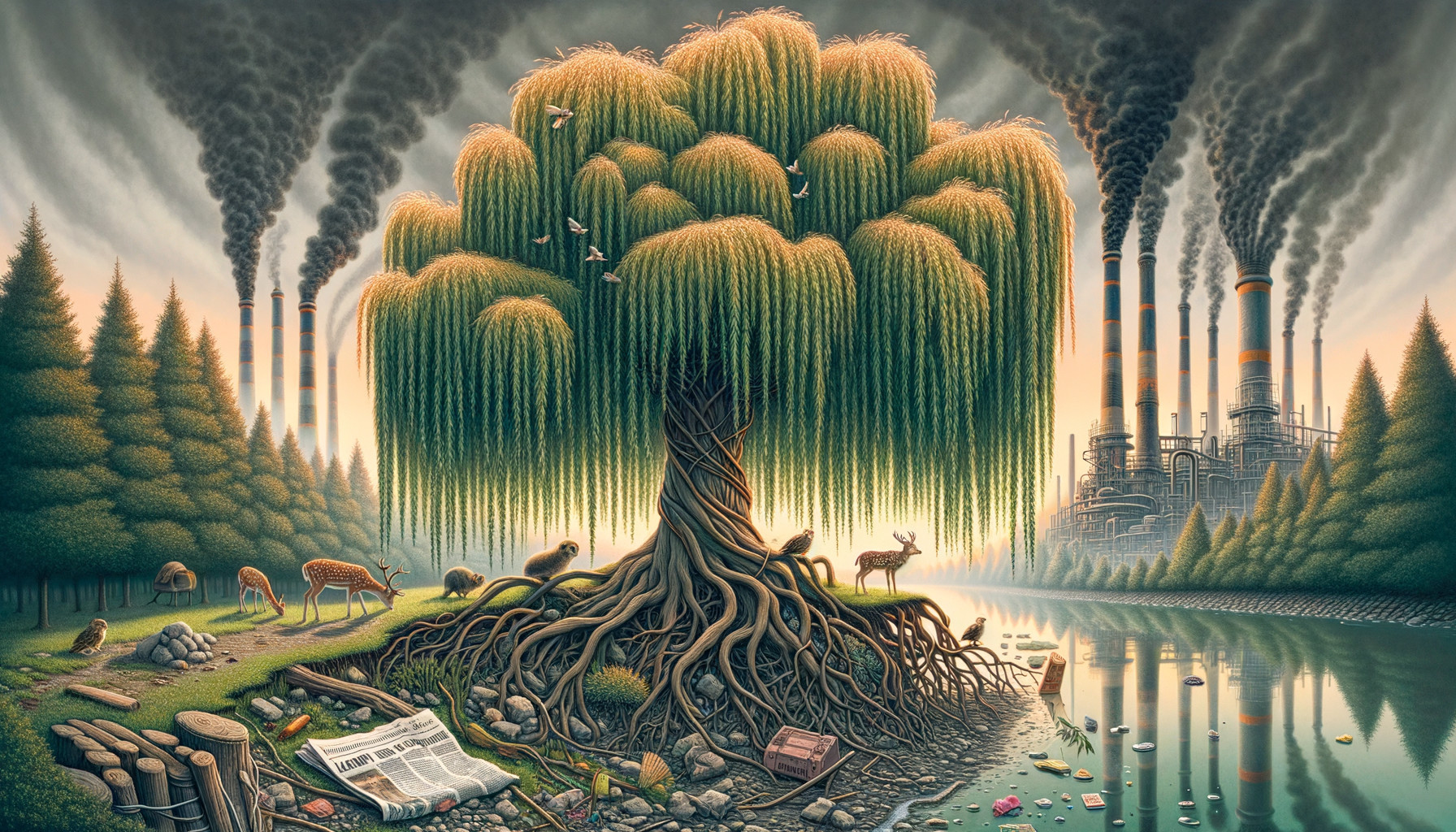 a weeping willow at the edge of a once-lush forest, now bordering an expanding city. Its branches hang heavy, not just with leaves but with tear-like droplets, reflecting the smog-filled sky. A few forest animals, including a disoriented deer and a somber owl, take shelter under its boughs. In the background, the stark contrast of nature's soft greens and browns against the harsh greys of industrial chimneys