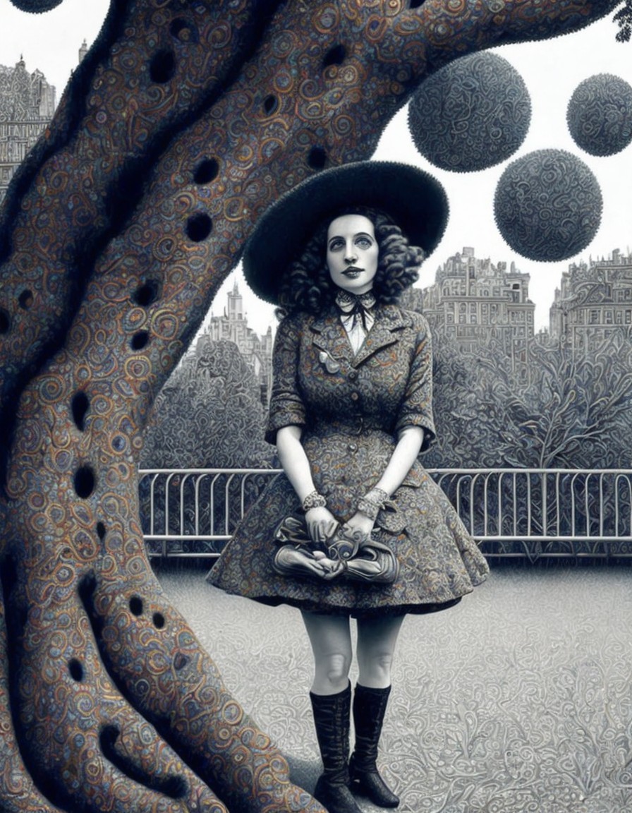 An illustrated woman in vintage attire stands beside an ornate tree, clutching a purse, set against a patterned backdrop.