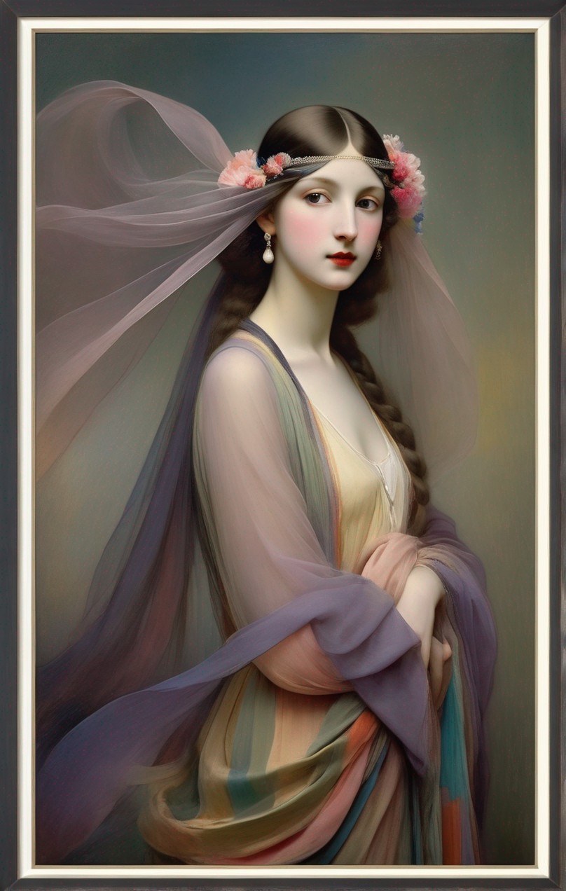 The veil between reality and fantasy is but a whisper, a mystical avatar of the air danced with grace and elegance. Its movements, fluid and mesmerizing, painted the sky with vibrant hues, captivating all who beheld its otherworldly performance. by Marie Laurencin, by Nicolai Abraham Abildgaard, detailed face features, sharp eyes, soft skin, harmonious, expressive, cinematic, photorealistic, evocative, gorgeous, lovely, heavenly, award winning, detailed face