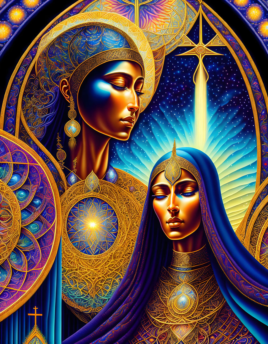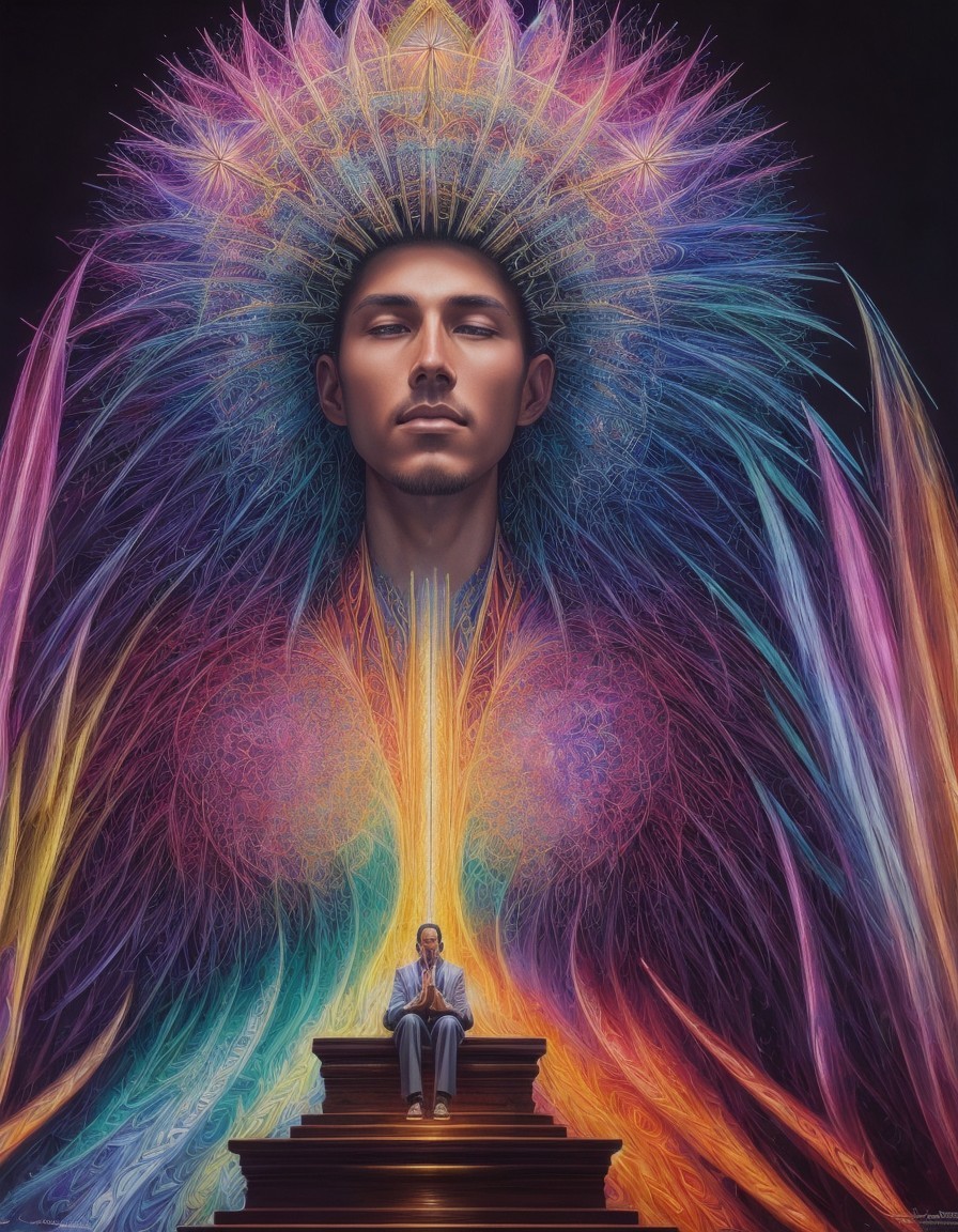 A spiritual awakening happens while sitting in the church congregation with an elaborate, colorful aura depicting enlightenment and spiritual awakening.