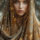 A young woman with long hair, wearing a draped beige scarf, gazes softly at the viewer. In front of her sits a detailed miniature village, complete with houses and a tower.