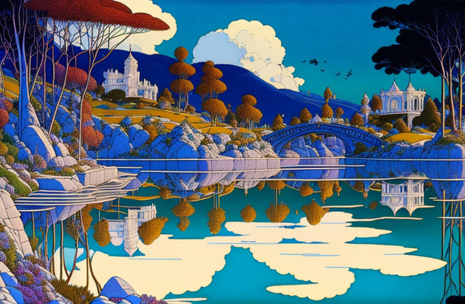 white city, white street, street cafe and landscape, lake, rocks, trees, cumulus clouds, style by Ivan Bilibin, by Harry Clarke, intricate detailed