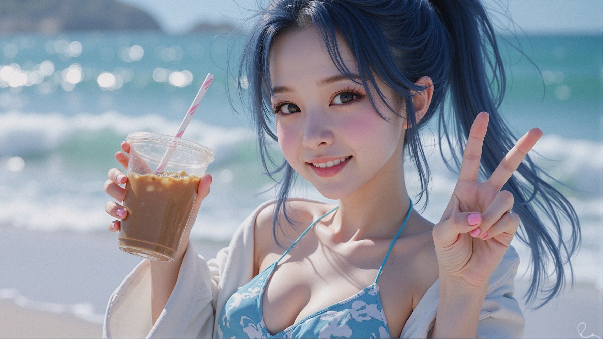 A vibrant beach scene features a young woman with blue hair, enjoying a cold drink. She flashes a peace sign, radiating joy amidst the sparkling ocean and sandy shore.