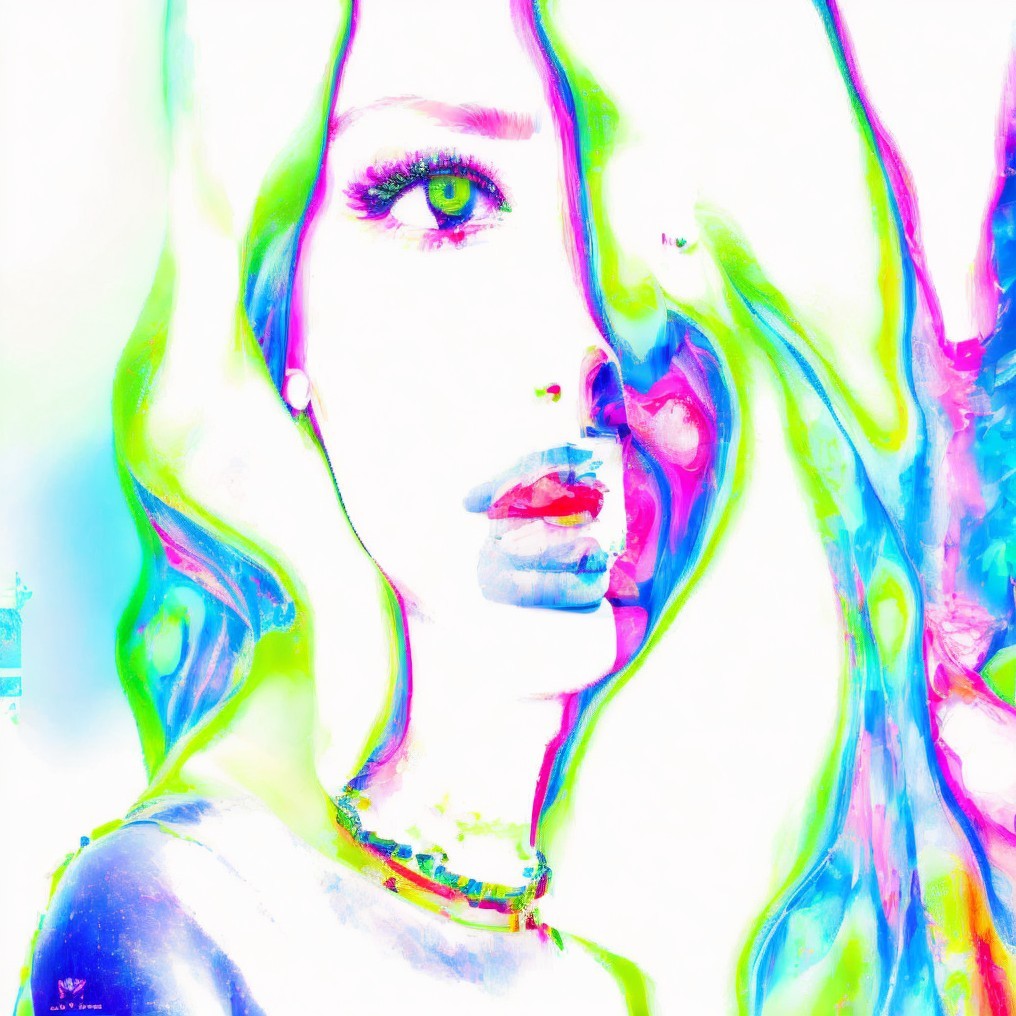 Colorful digital artwork featuring woman's face with blue eyes and neon watercolor splashes