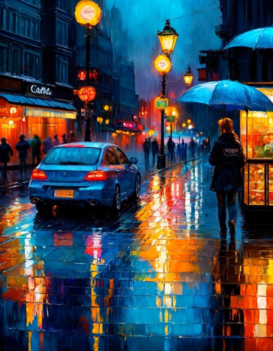A sleek blue car parked on a rain-soaked street, reflecting vibrant city lights. People stroll by under glowing street lamps in a bustling evening atmosphere.