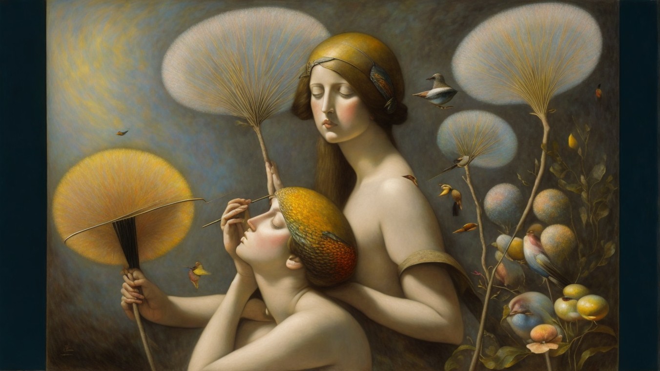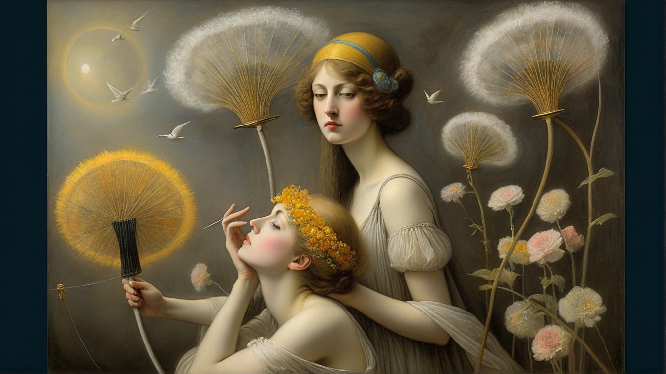 A mystical painting features two ethereal figures with flowing hair, set against a dreamy background adorned with luminous orbs. The connection between them evokes intimacy and serenity.