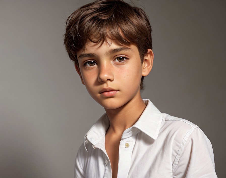 Prompt: "A thirteen years old boy, cute, rounded face, innocent, mischeavous, funny, caramel short hair, bright caramel eyes, tanned skin, wearing a white shirt"