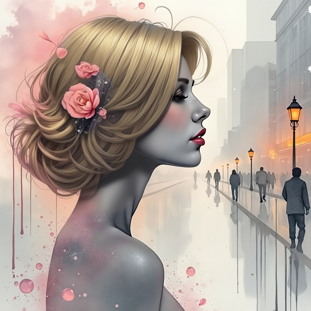 A serene profile of a young woman with blonde hair adorned with flowers, set against a misty street scene illuminated by vintage streetlights, capturing a dreamy, romantic atmosphere.