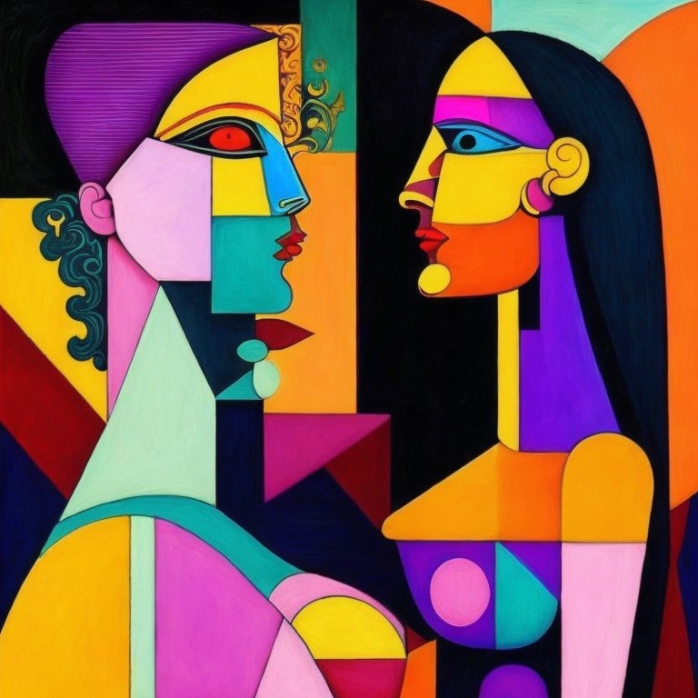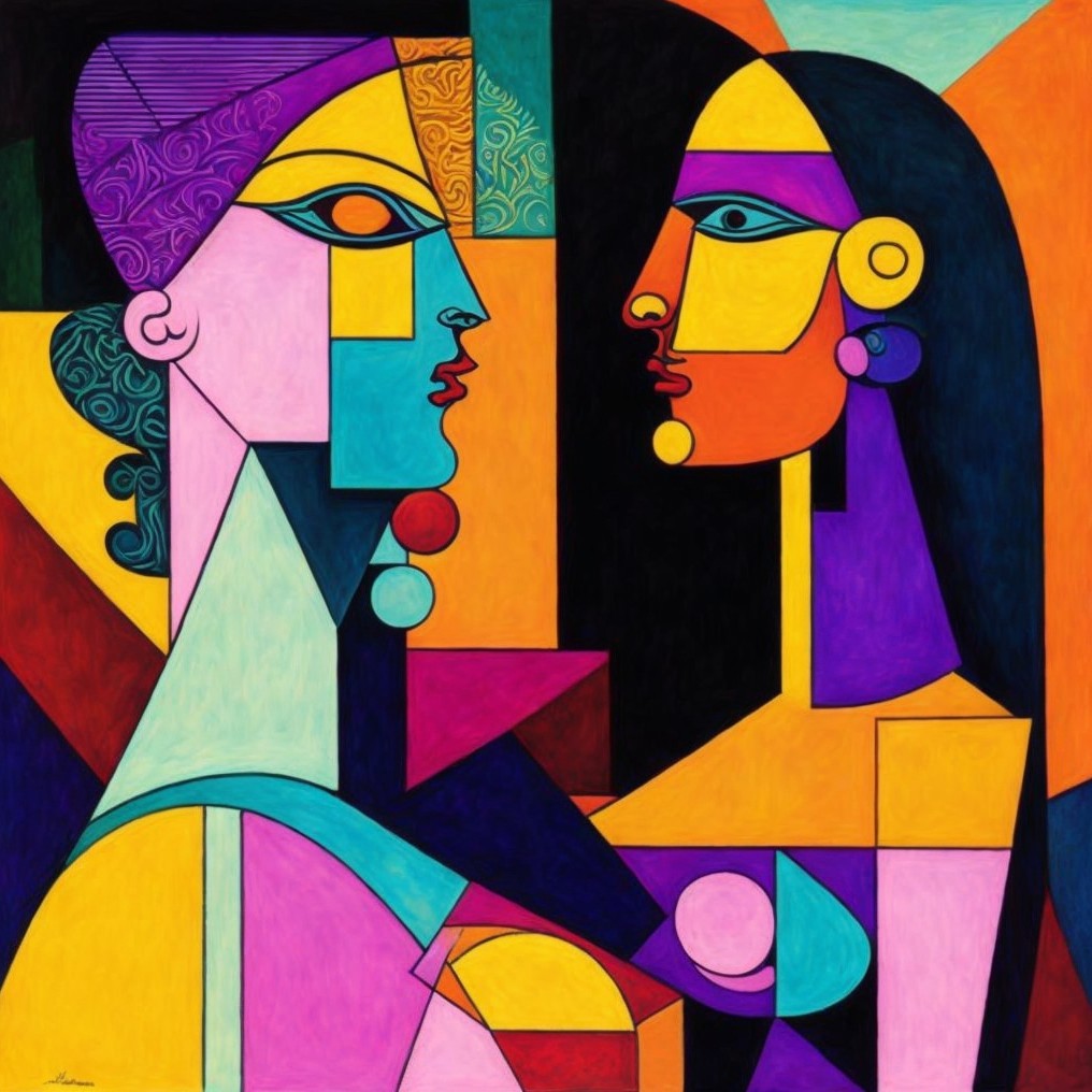 Abstract cubist painting of two stylized faces in profile with vibrant colors and geometric shapes.