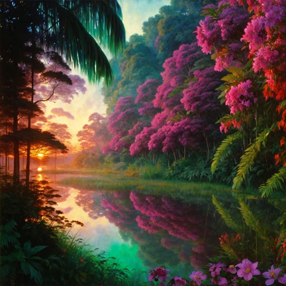 + Prompt:NO PEOPLE, NO MAT, NO FRAME, NO ANGLED IMAGE, Full page, single image, 3D oil, spectacular sunset by William Turner, high-definition lush rainforest, lacy silver-sheened green plants and ferns, multi-color night blooming flowers, by Monet, with elements in the style of Gustav Klimt and elements in the style of Jan Toorop