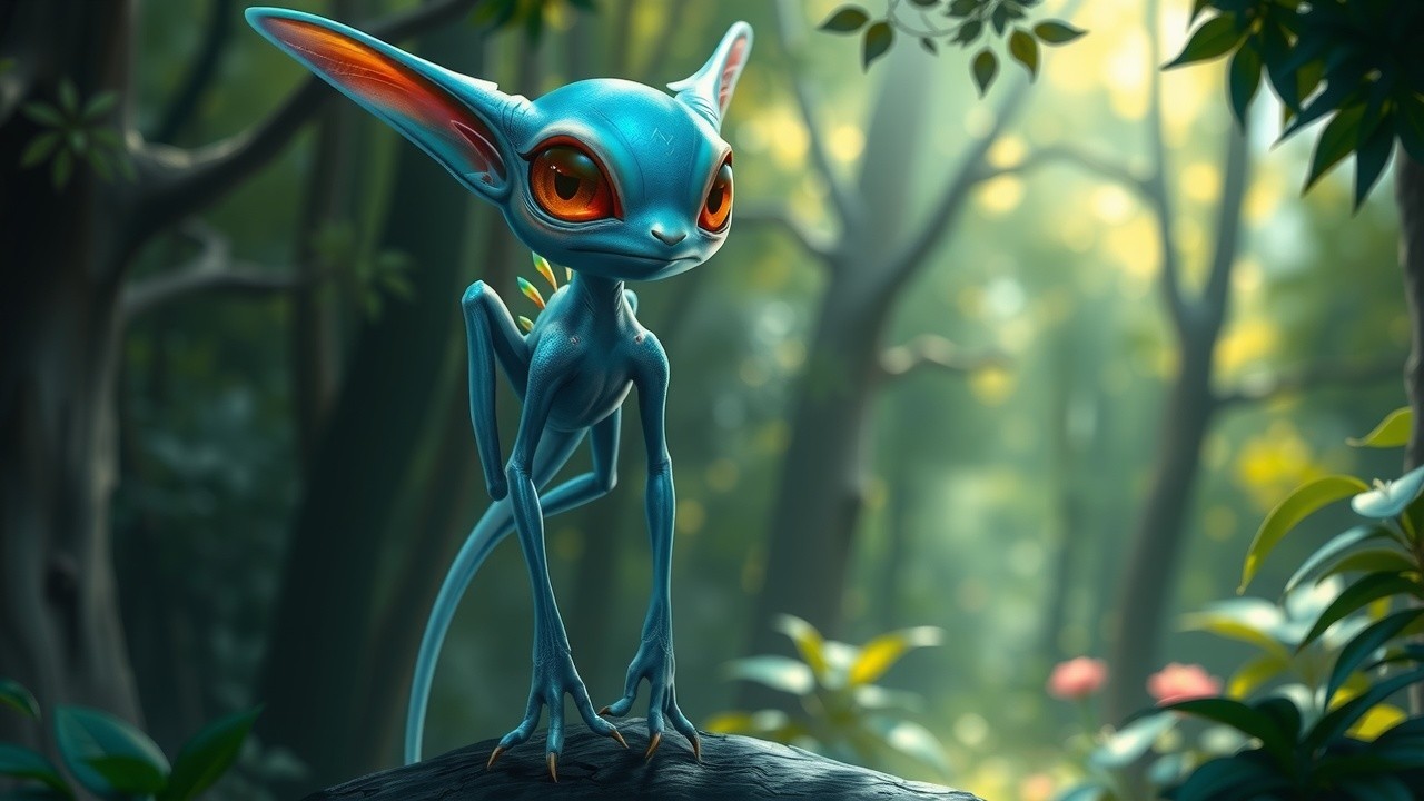 Prompt: "**Prompt:** Create an image of a fantastical creature standing in a lush, mystical forest. The creature has a slender, elongated body with smooth, iridescent skin in shades of turquoise and deep blue, reflecting a shimmering quality. Its head is somewhat oversized with large, expressive amber eyes that are prominent and rounded, resembling those of a gentle curiosity. Two elongated ears, somewhat reminiscent of butterfly wings, protrude from the sides of its head.