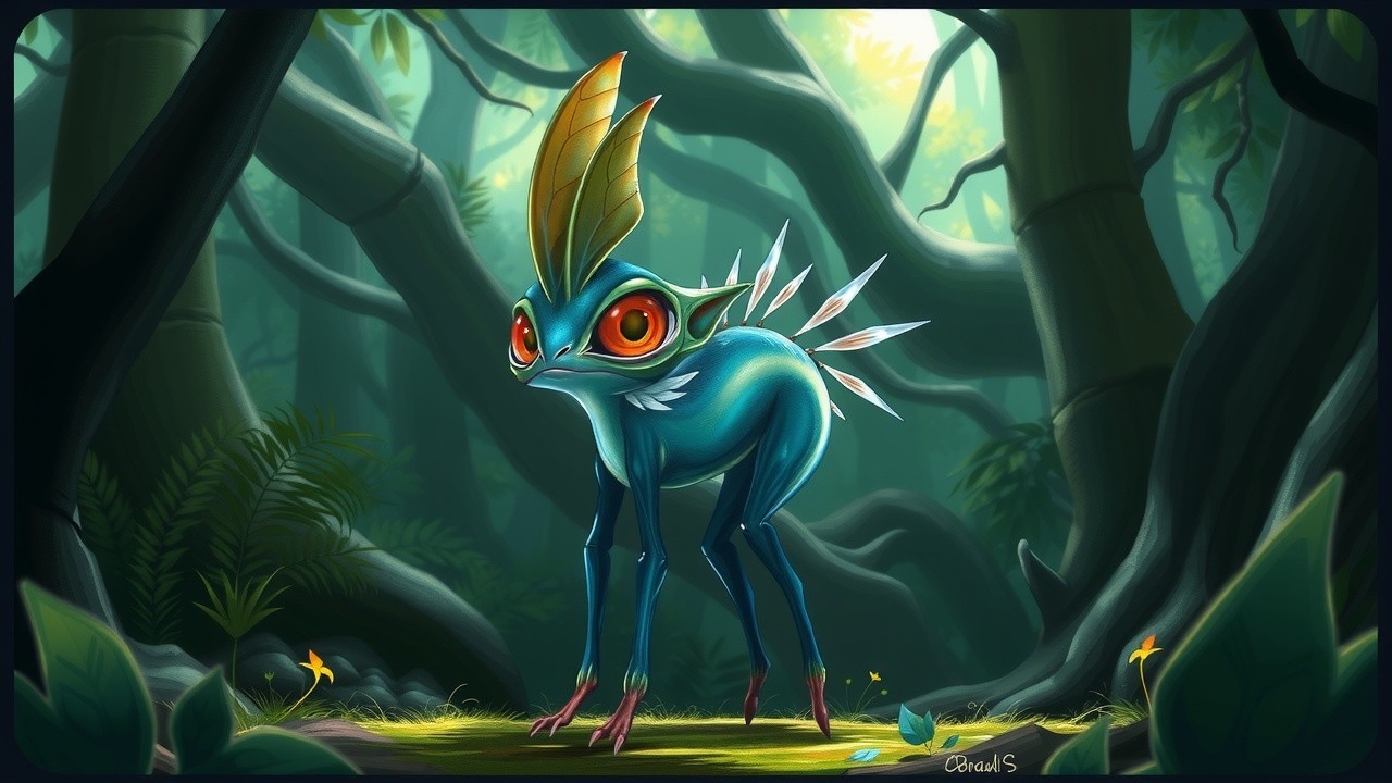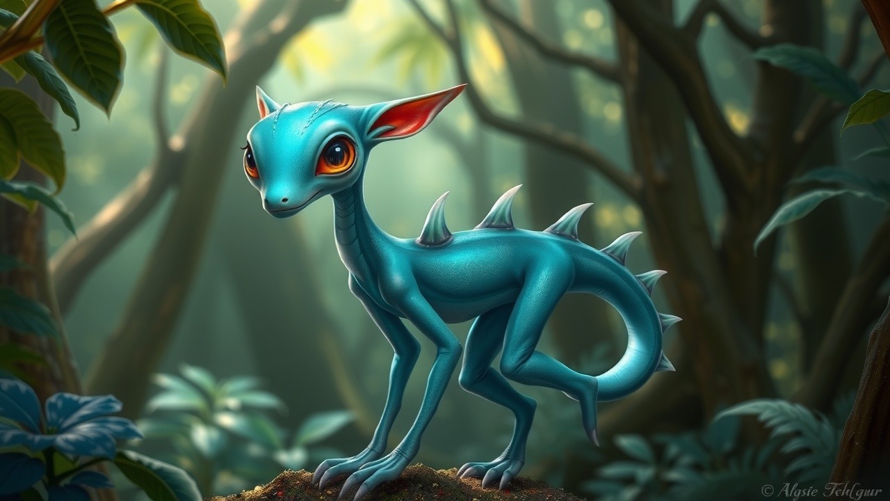 **Prompt:** Create an image of a fantastical creature standing in a lush, mystical forest. The creature has a slender, elongated body with smooth, iridescent skin in shades of turquoise and deep blue, reflecting a shimmering quality. Its head is somewhat oversized with large, expressive amber eyes that are prominent and rounded, resembling those of a gentle curiosity. Two elongated ears, somewhat reminiscent of butterfly wings, protrude from the sides of its head.