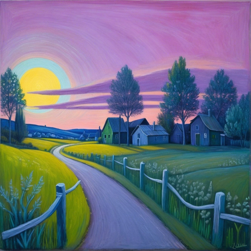 A serene landscape features two charming houses surrounded by lush greenery, bathed in soft sunset hues. A winding road leads toward the horizon, with vibrant trees framing the scene.