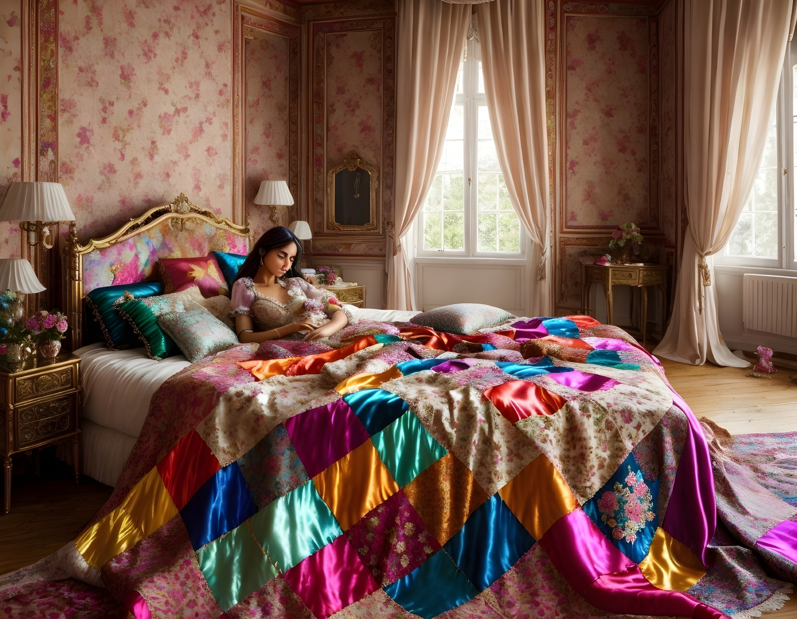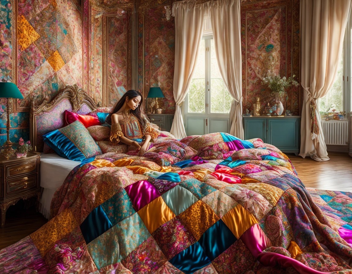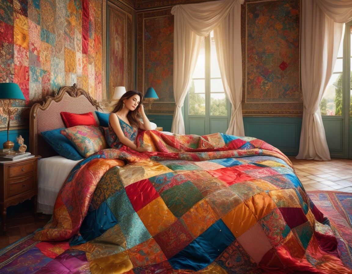 Prompt: "a beautiful woman waking up in a beautifully decorated room with colorful patchwork of silk, her bedroom seems like it belongs to a rich family from the Mediterranean."