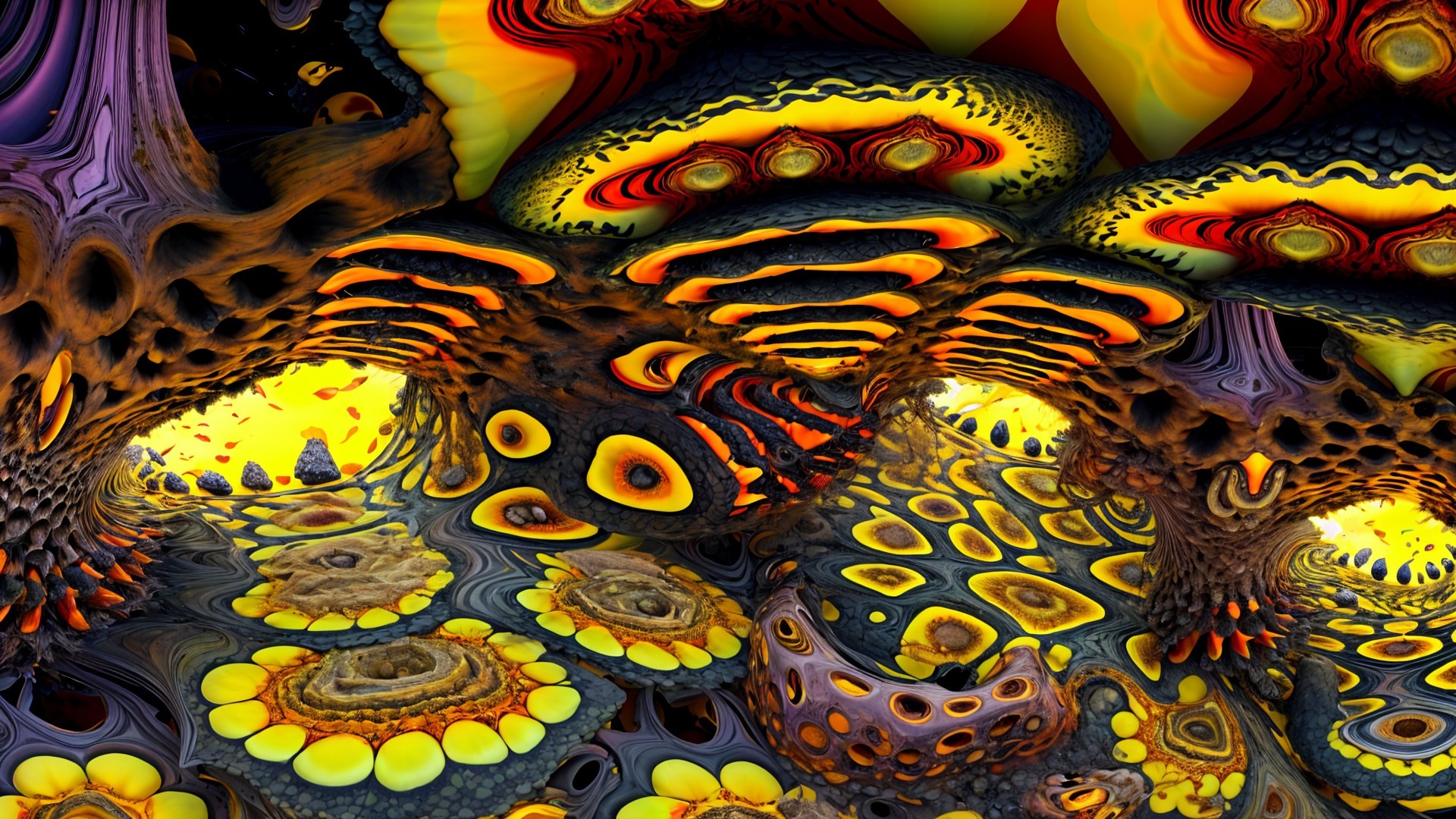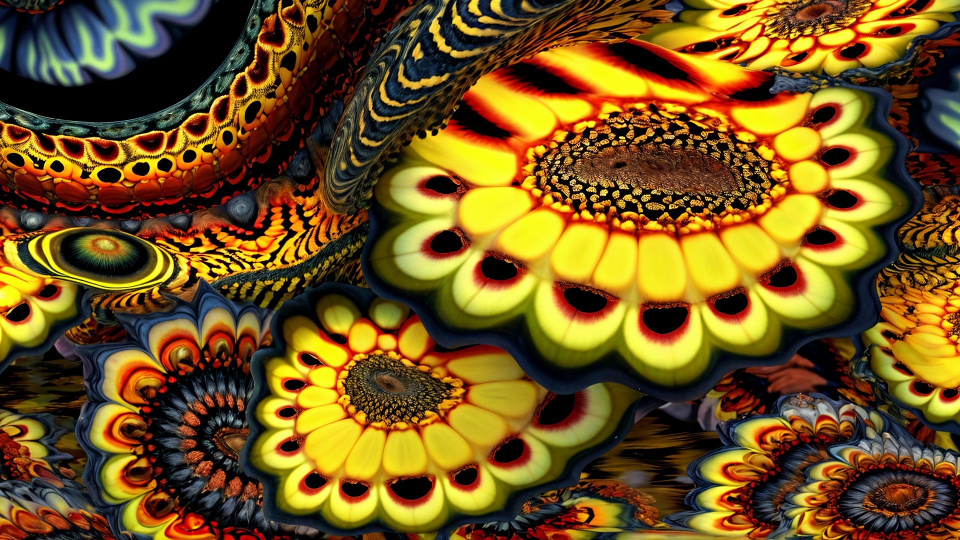 A vibrant, swirling abstract design features bold sunflowers intertwined with flowing waves and intricate patterns, showcasing rich colors of yellow, blue, and orange for a lively, dynamic feel.