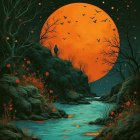 A serene landscape features a glowing orange moon illuminating a rocky outcrop. A figure stands by a tranquil river, surrounded by dark trees and vibrant autumn flowers, while birds fly overhead.