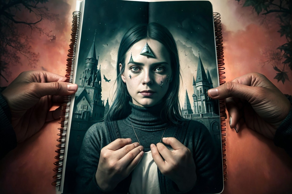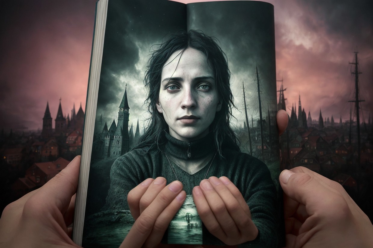 a simulacrum of Erik Johansson's work. hands holding Book with witch reaching out, cosmic backgrounds, Eyepunk, realism, dof, depth of field