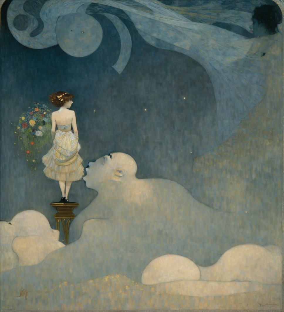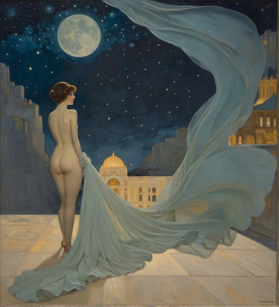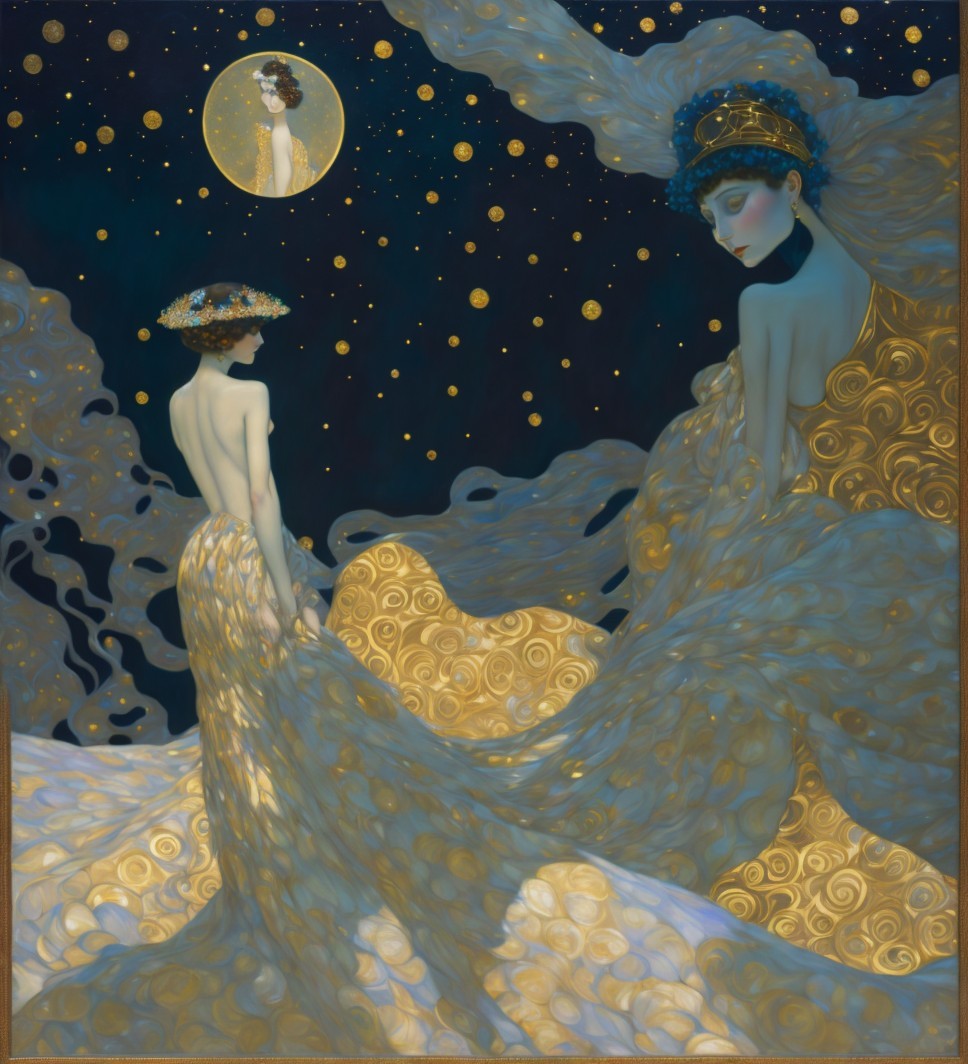 This artwork features two elegant women in luxurious evening gowns, illuminated by the soft glow of a full moon. The dreamy backdrop includes clouds and a serene night sky, enhancing the atmosphere.