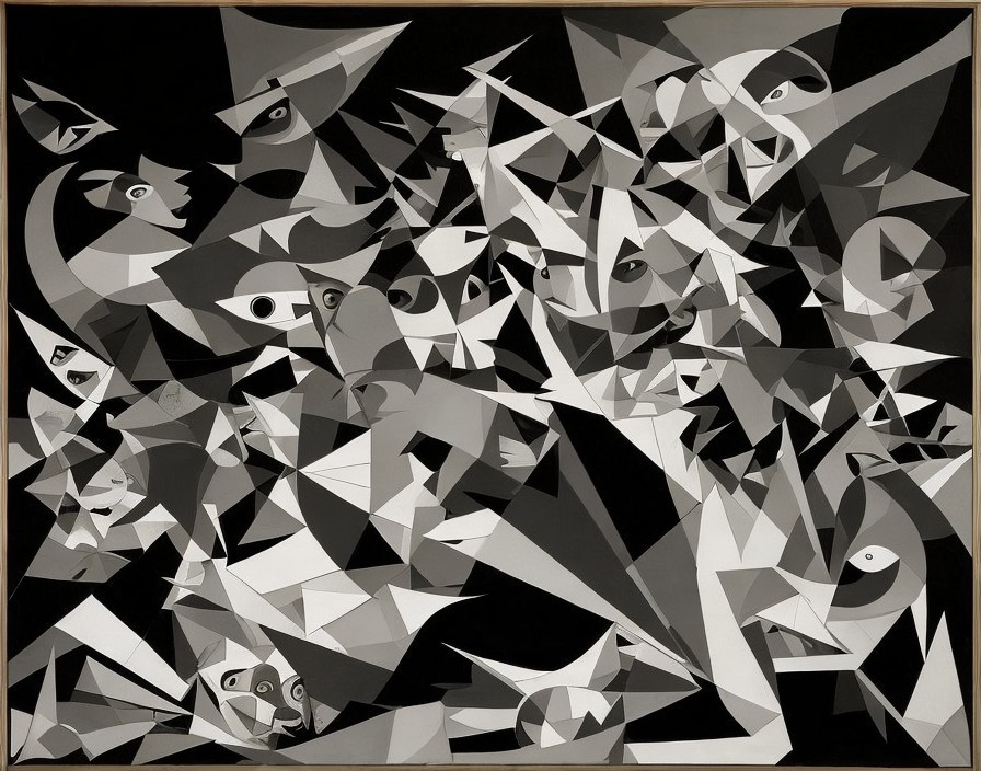 Two women in maid outfits are lying on a bed with four dogs, with monochrome coloring and playful expressions.