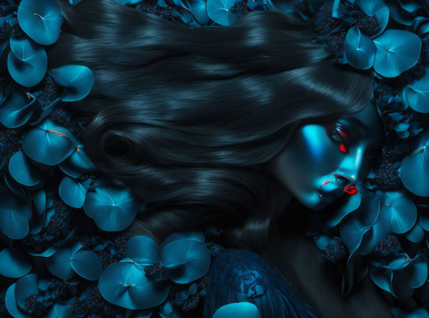 Woman with Voluminous Black Hair and Blue Flowers in Blue Floral Setting