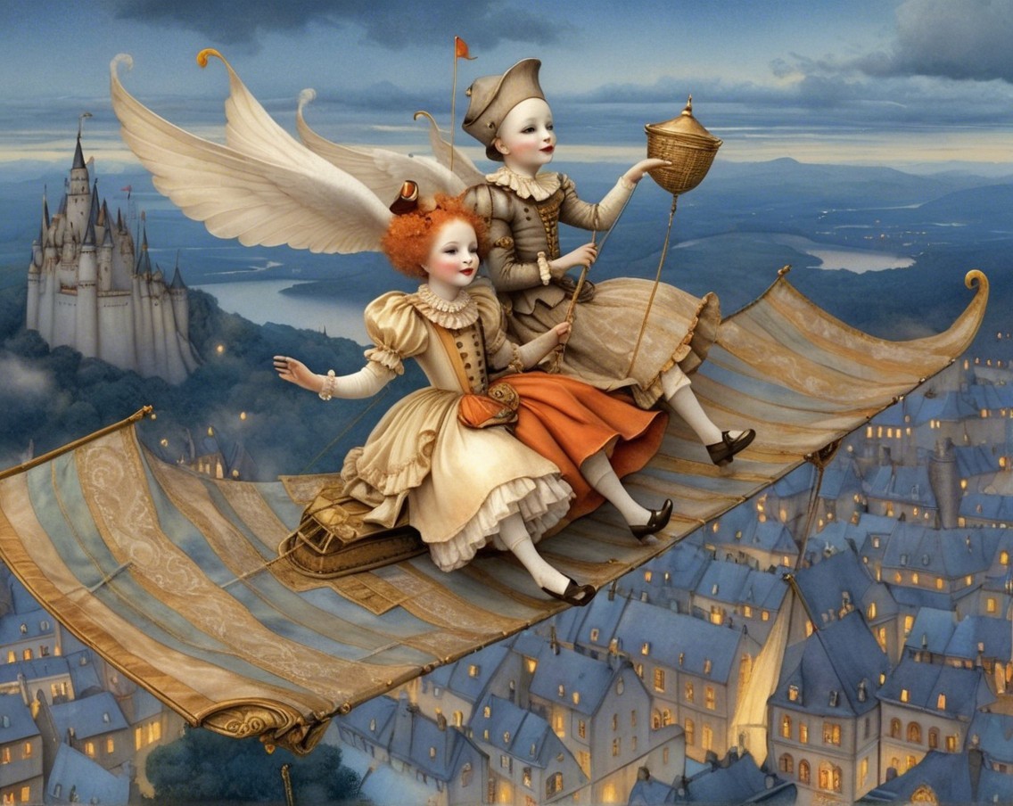 Close up, adorable Pierrot creature mythological world up up and away, in the style of Alexander Jansson. by Catrin Welz-Stein, Michael Parkes